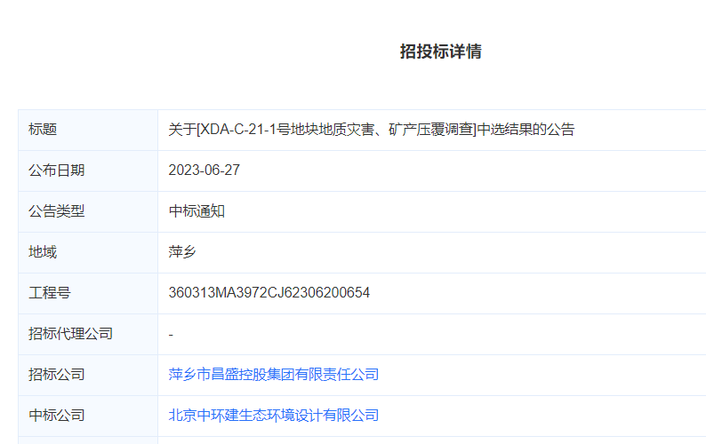 关于[XDA-C-21-1号地块地质灾害、矿产压覆调查]中选结果的公告(中标)